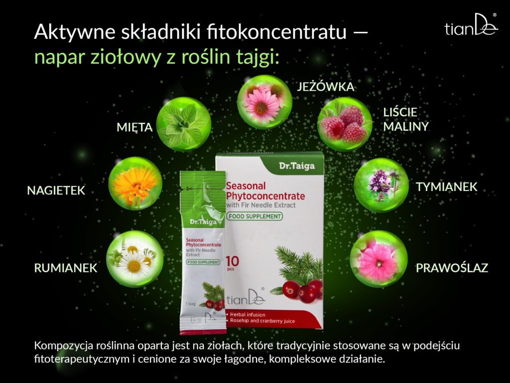 W składzie fitokoncentratu Dr. Taiga znajduje się bogaty kompleks ziołowy oparty na tajgowym naparze z roślin: rumianku, nagietka, liści maliny, mięty, jeżówki, tymianku oraz prawoślazu. Fitokompleks łączy starannie dobrane składniki roślinne, które tradycyjnie wykorzystywane są w podejściu fitoterapeutycznym i cenione za swoje łagodne, wielokierunkowe działanie. Receptura uzupełnia dietę w naturalne substancje roślinne i sprzyja utrzymaniu dobrego samopoczucia oraz uczucia komfortu, szczególnie w okresach zmian sezonowych.