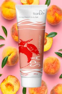 Ekstrakt z brzoskwini usprawnia procesy metaboliczne, odbudowuje, zmiękcza i odżywia skórę. Drobne kryształki soli delikatnie usuwają obumarłe komórki, stymulując proces regeneracji. Posiadają lekki efekt peelingu, sól aktywuje krążenie, usuwa toksyny, podnosi tonus i elastyczność skóry, sprzyja redukcji cellulitu.
